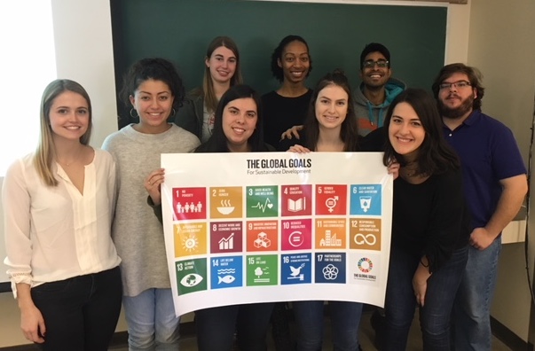 Photo Info: 1) Top: Teacher candidates in our Global Education Cohort. PED 3154. Winter 2017. We received this beautiful laminated poster from Guy Hamlin’s grade 8 class in Belfast, Maine, who were interested in forging connections with other schools to study the SDGs; 2) Tweets: Guy Hamlin’s class calls out for partners; 3) Teacher Candidates tweet back to Guy’s class with the poster they shared with us.