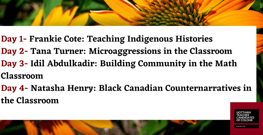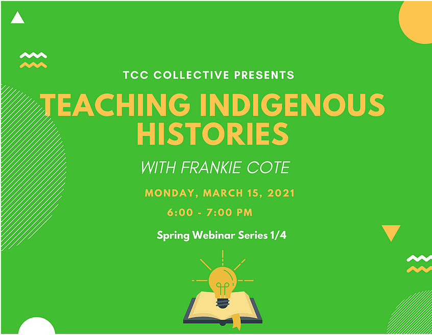 “The Teacher Candidates of Colour (TCC) Collective, is excited to announce the Spring Webinar Series beginning March 15-18, 2021. The Spring Webinar Series is made possible with the support and funding from the Vice-Dean of Governance and Student Affairs, Dr. Francis Bangou’s office. Our series will feature four speakers, each speaking on a different evening (i.e. 6pm or 7pm EST), to provide teacher candidates, graduate students, and teachers an opportunity to learn and (un)learn. Our esteemed speakers will speak on a variety of topics: Teaching Indigenous Histories, Microaggressions in the Classroom, Building Community in the Math Classroom, and Black Canadian Counternarratives in the Classroom. We are thrilled to begin our session with our keynote speaker, Frankie Cote!”