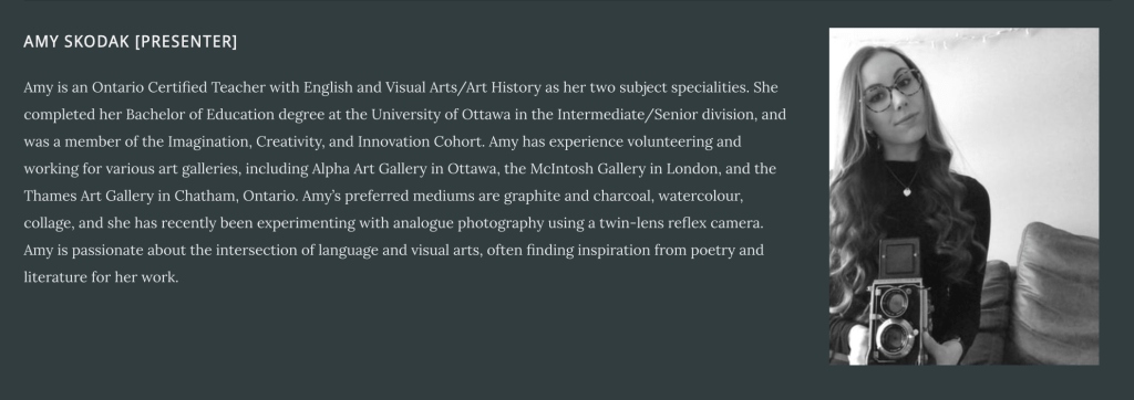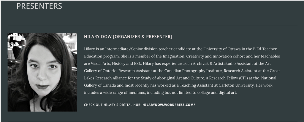 Organizer Hilary Dow will be co-presenting with fellow teacher candidates Amy Skodak and Isabella Di Stefano to guide you through these 4 interactive workshops where you will have the opportunity to participate in guided art activities that you can use in the classroom. Here are some of the suggested materials you might want to have on hand to participate in the art activities for the optional studio hour: